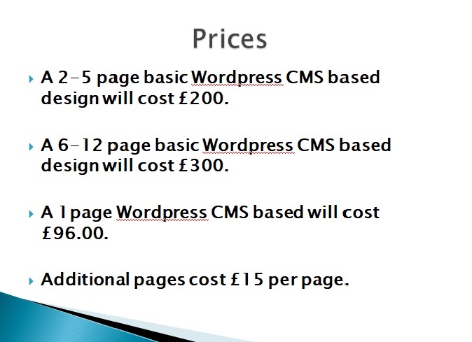 A 2-5 page basic design would cost £200 and 2 weeks to design as there is one designer (WordPress CMS included.)